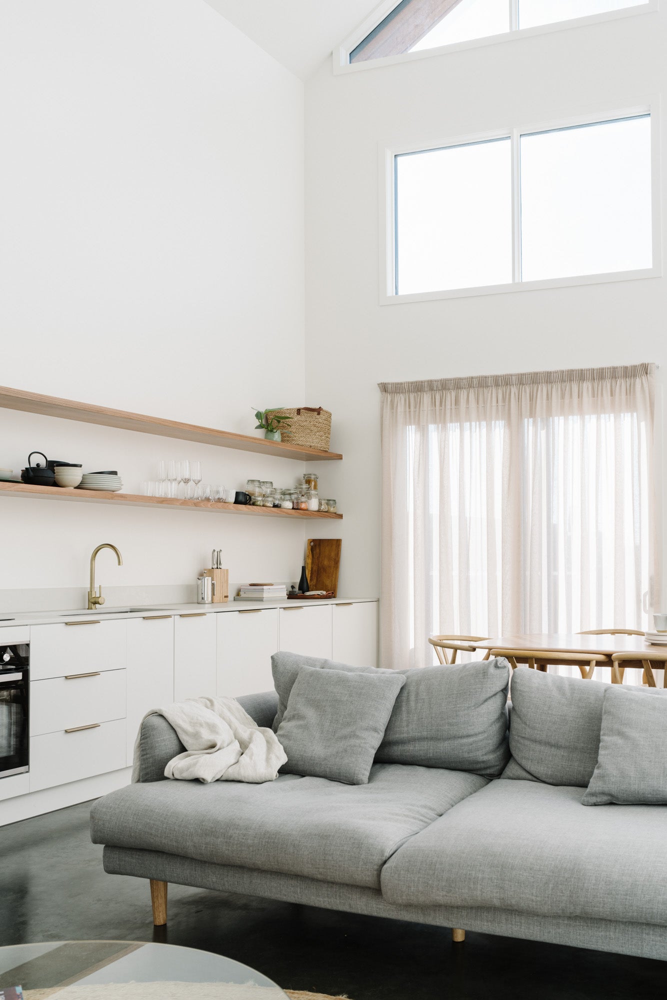 The Bungalow’s main living area benefits from a double-height raked ceiling, which creates a sense of calm that’s ideal for quiet reflection, and fills the home with natural light that streams through the large raked windows. The Bungalow may present a simplified approach to living, but it delivers it with such style and grace that the home stands as a flagship example of sustainable and minimalist construction.