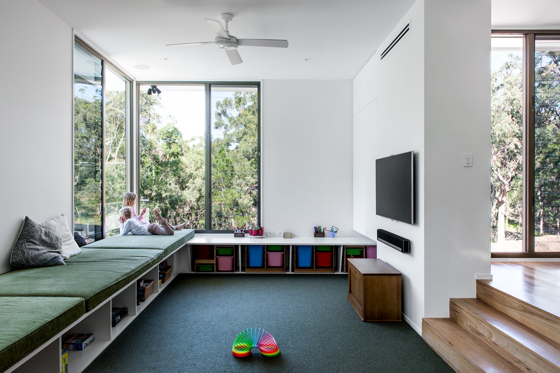 Throughout the home, spaces are tailored for each member of the family. For the youngest generation, there is a sunken playroom fittingly known as ‘the pit’, which offers a space for play and fun. For quiet time, each bedroom provides solitude, with plenty of light and a sensation of being in a private haven among the trees. From the shared living spaces, the outside is seamlessly accessed via sliding doors and presents the perfect place to host a relaxed dinner party or cool off with a dip in the pool.